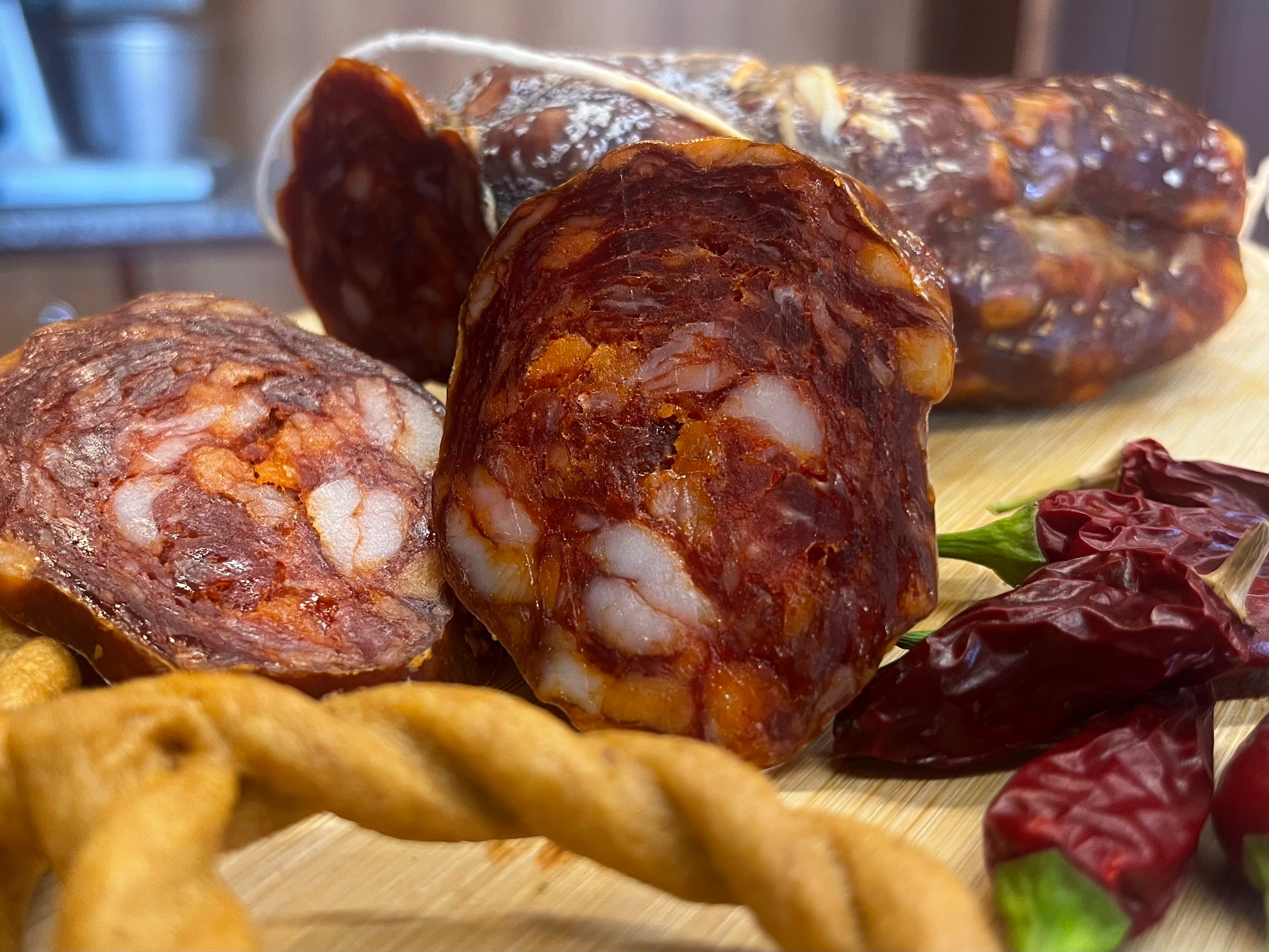 La collezione dei salumi del nostro shop racchiude l’essenza più autentica della tradizione norcina calabrese, una selezione di prodotti artigianali realizzati con carni pregiate e ingredienti naturali, seguendo metodi antichi tramandati da generazioni. Ogni salume nasce da suini allevati allo stato semibrado nelle campagne calabresi, con almeno dodici mesi di età e nutriti con cereali e materie prime provenienti da filiera corta. Questo garantisce una materia prima ricca, matura e di qualità superiore, capace di esprimere al meglio i profumi e i sapori del territorio.